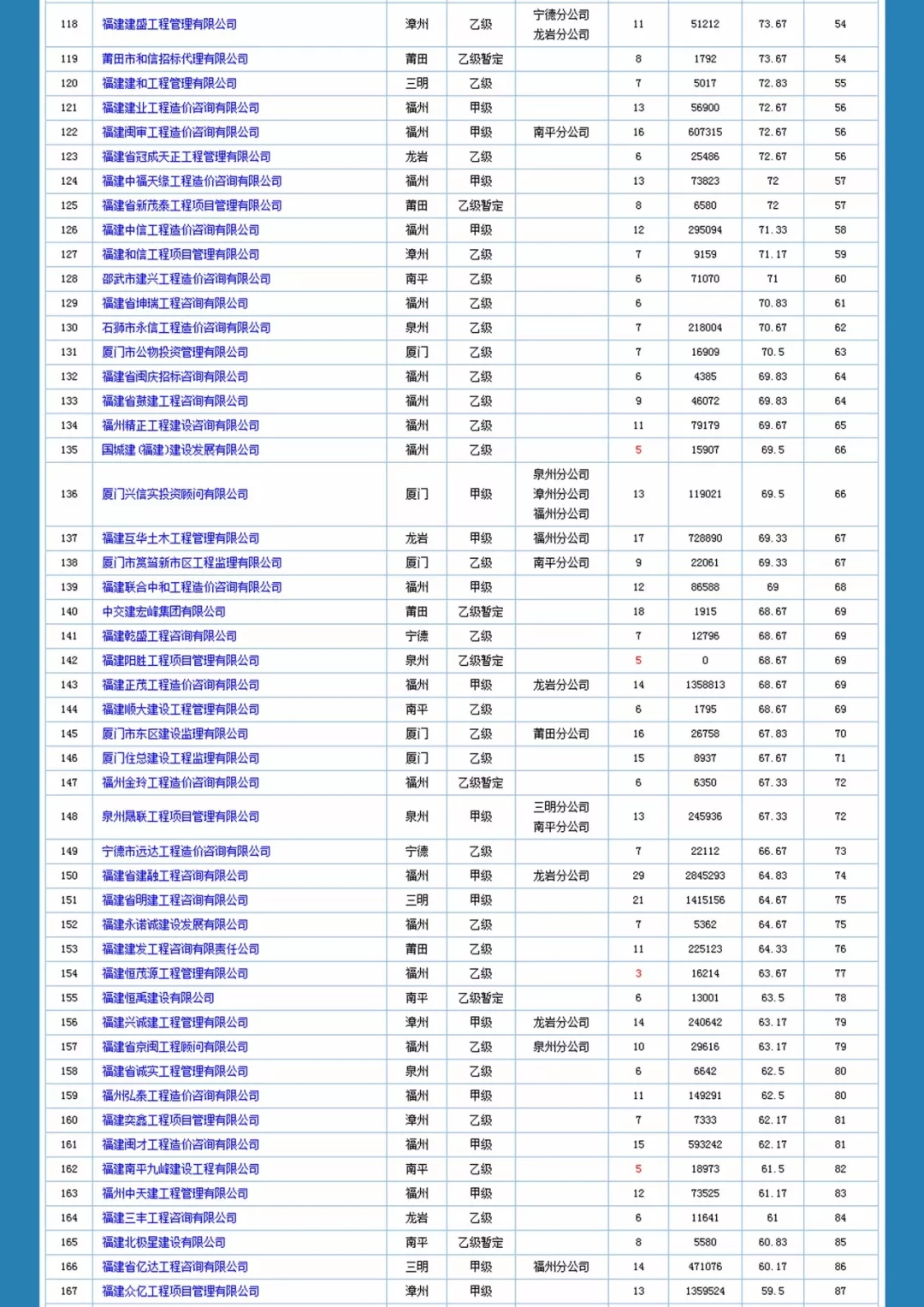 福建省造价咨询企业信用一览表如下:
